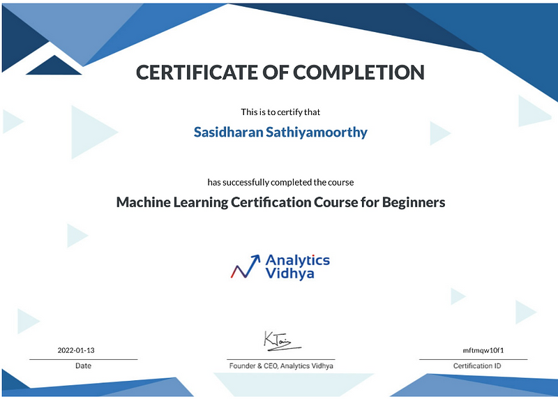 Machine Learning Certification Course For Beginners (Analytics Vidhya)